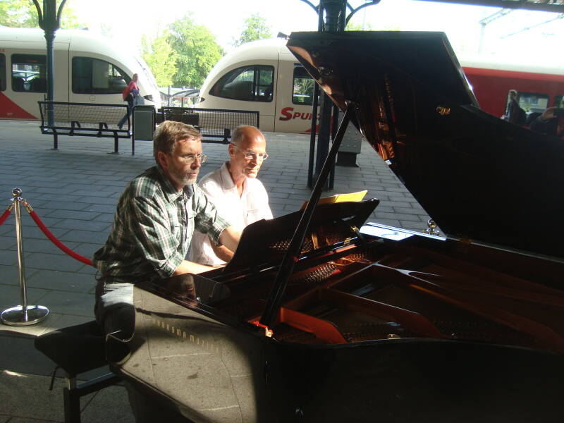 Enkele foto's van een quatre-mains optreden op station Leeuwarden tijdens cityproms op 26 juni 2014. Het was een aparte belevenis en onrustig spelen met al die lopende mensen en vertrekkende treinen. Publiek bleef regelmatig luisteren staand of zittend op enkele stoelen. Het Friesch Dagblad had zelfs een foto van een duo in de krant gezet!